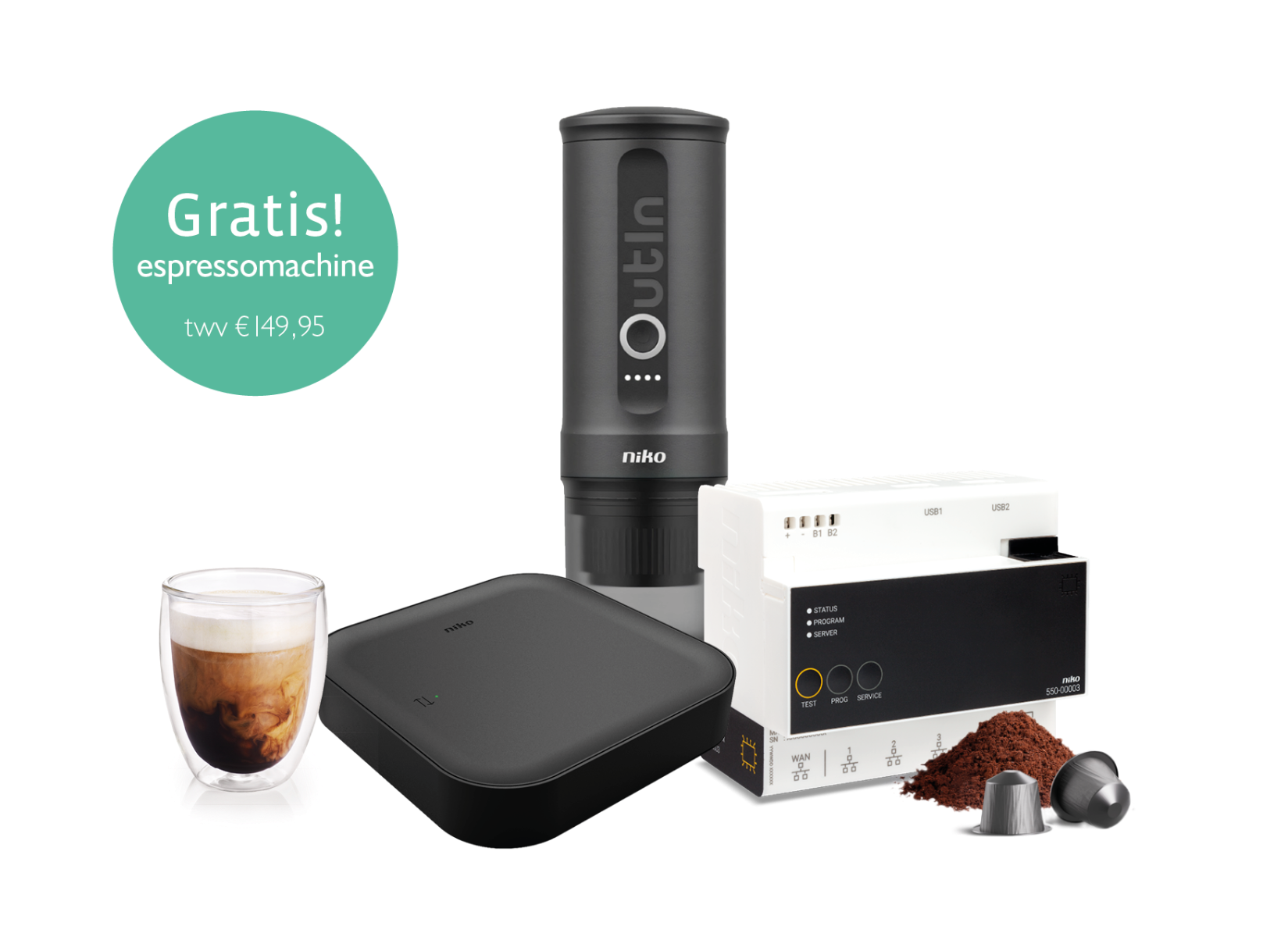 Bij aankoop van een Connected Controller of Draadloze slimme hub voor Niko Home Control ontvang je een gratis OutIn-espressomachine ter waarde van €149,99!